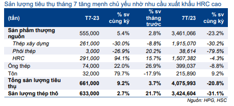 Bảng 1: Sản lượng tiêu thụ tháng 7 và 7 tháng đầu năm 2023, HPG