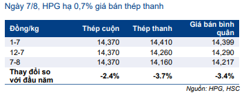 Ngày 7/8/2023, HPG cũng thông báo giảm thêm 100đ/kg (tương đương 0,7%) giá bán thép thanh xuống 14.160đ/kg (giảm 3,7% so với đầu năm) trong khi giá bán thép cuộn được giữ nguyên ở mức 14.370đ/kg (giảm 2,4% so với đầu năm), do nhu cầu thép xây dựng trong nước sụt giảm kéo dài.