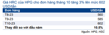 Vào ngày 4/8/2023, HPG đã nâng giá bán HRC lên 602 USD/tấn, tăng 3% so với tháng trước, đối với các đơn hàng giao hàng tháng 9 và tháng 10/2023, theo sát diễn biến giá HRC tại Trung Quốc và bắt kịp giá HRC nhập khẩu vào Việt Nam. Động thái này sẽ hỗ trợ tỷ suất lợi nhuận của HPG trong Q4/2023.