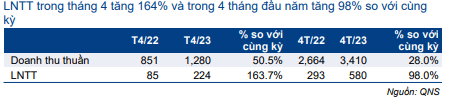 Bảng 1: KQKD T4/2023 và 4 tháng đầu năm 2023, QNS