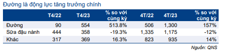 Trong tháng 4/2023, doanh thu thuần mảng đường đạt 554 tỷ đồng so với 90 tỷ đồng trong tháng 4/2022 với sản lượng tiêu thụ tăng lên 32.000 tấn so với 6.500 tấn trong tháng 4/2022. sản lượng tiêu thụ tăng mạnh chủ yếu do (1) mức nền thấp cùng kỳ năm ngoái, do sản lượng tiêu thụ năm ngoái thấp bất thường trước thời điểm áp dụng thuế chống bán phá giá và thuế chống trợ cấp đối với đường xuất xứ từ các nước ASEAN và (2) nhu cầu đường phục hồi từ các doanh nghiệp sản xuất thực phẩm & đồ uống.