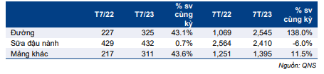 Trong tháng 7/2023, doanh thu thuần mảng đường đạt 325 tỷ đồng, tăng 43% so với cùng kỳ, nhờ sản lượng tiêu thụ đường tăng 55%. LNTT tăng mạnh 231% so với cùng kỳ đạt 98 tỷ đồng, nhờ sản lượng tiêu thụ đường cao. Tăng trưởng vẫn khả quan nhưng đã chậm lại so với mức tăng của doanh thu và LNTT trong 6 tháng đầu năm 2023 (tăng lần lượt 164% và 490% so với cùng kỳ) do mức nền mảng đường thấp trong nửa đầu năm 2022 (do sản lượng tiêu thụ và giá bán thấp).