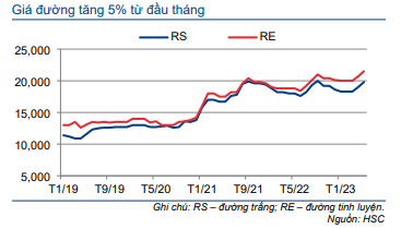 Giá đường trong nước đã có những tín hiệu tích cực kể từ đầu tháng 5/2023. Trước đó, giá bán đường dao động trong biên độ hẹp trong 4 tháng đầu năm 2023 do đường nhập lậu qua đường biên giới và các biện pháp kiểm soát giá. Giá đường RS (đường trắng) đang giao động quanh mức 19.000-20.000đ/kg so với 18.000-19.000đ/kg trong 4 tháng đầu năm 2023.