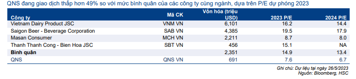 Trong khi đó, QNS đang giao dịch với P/E dự phóng 2023 là 7,6 lần, thấp hơn 49% so với mức bình quân của các công ty cùng ngành là 14,9 lần (Bảng 17).