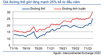 Giá đường thế giới tăng mạnh 25% kể từ đầu năm và do một số yếu tố bao gồm: hạn hán nghiêm trọng cản trở vụ thu hoạch tại Ấn Độ (quốc gia sản xuất lớn thứ 2 thế giới), sản lượng mía đường tại Brazil (quốc gia sản xuất mía đường lớn nhất thế giới) được dự báo tăng, nhưng dự kiến sẽ phân bổ phần lớn hơn để sản xuất ethanol sau khi quốc gia này chấm dứt chính sách miễn thuế nhập khẩu ethanol từ tháng 2/2023, từ đó thúc đẩy nhu cầu ethanol trong nước, vốn được sản xuất từ mía đường.