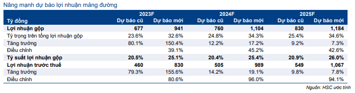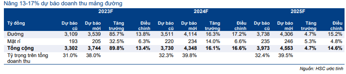 Do KQKD vượt trội của mảng đường, HSC nâng 13-18% dự báo lợi nhuận thuần trong giai đoạn 2023-2025 lên lần lượt 1.702 tỷ đồng (tăng trưởng 32,3%), 1.941 tỷ đồng (tăng trưởng 14,1%) và 2.107 tỷ đồng (tăng trưởng 8,6%).
