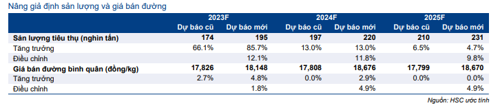 HSC nâng lần lượt 13,1%, 16,1% và 14,2% dự báo doanh thu mảng đường (bao gồm mật rỉ, một phụ phẩm trong quá trình sản xuất đường) trong giai đoạn 2023-2025 đạt lần lượt 3.744 tỷ đồng, 4.348 tỷ đồng và 4.553 tỷ đồng. Chúng tôi cũng nâng dự báo sản lượng tiêu thụ sau khi điều chỉnh tăng dự báo sản lượng mía. Ngoài ra, chúng tôi cũng nâng dự báo giá bán bình quân để phản ánh diễn biến tích cực gần đây của giá đường trong nước.