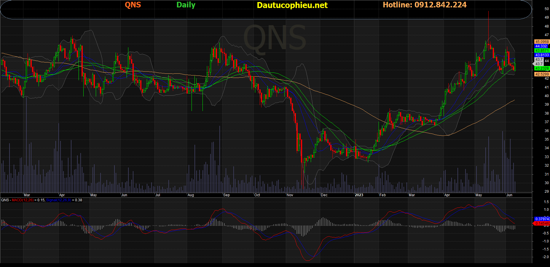 Đồ thị cổ phiếu QNS phiên giao dịch ngày 09/06/2023. Nguồn: AmiBroker