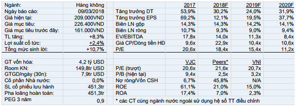 Chúng tôi dự báo doanh thu và LNST 2018 sẽ tăng lần lượt 32,9% và 13,8%, trong đó LNST cốt lõi dự kiến sẽ tăng 53,9% nhờ VJC tích cực mở thêm nhiều tuyến bay quốc tế một cách hiệu quả.Rủi ro chính: (1) tăng trưởng hoạt động quốc tế thấp hơn so với dự báo; (2) nhu cầu không đủ để khai thác hiệu quả số máy bay tăng thêm; (3) giá dầu liên tục tăng mạnh; (4) lãi suất tăng khiến các điều khoản bán và thuê máy bay không có lợi như trước. VJC hiện vẫn tỏ ra hấp dẫn với PEG 3 năm là 0,9 lần.