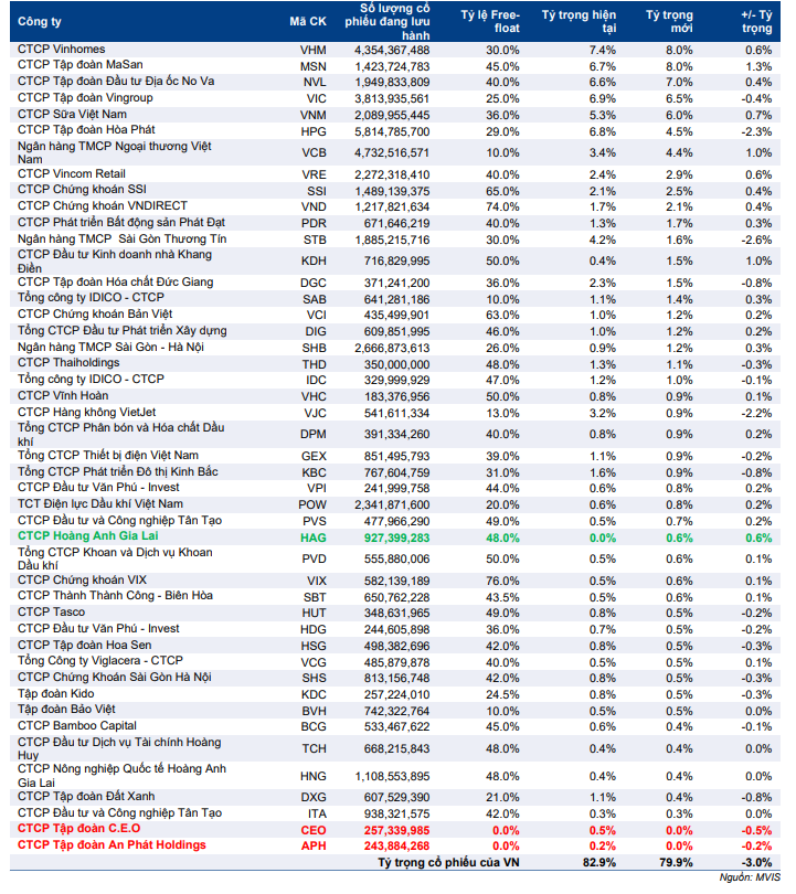 Trong đợt review này, tỷ trọng của HPG và STB đã giảm đáng kể, do tỷ lệ free-float của HPG và STB đã được MVIS Vietnam điều chỉnh giảm mạnh xuống lần lượt 29% và 30% (so với lần lượt 67% và 100% trong Q2/2022).