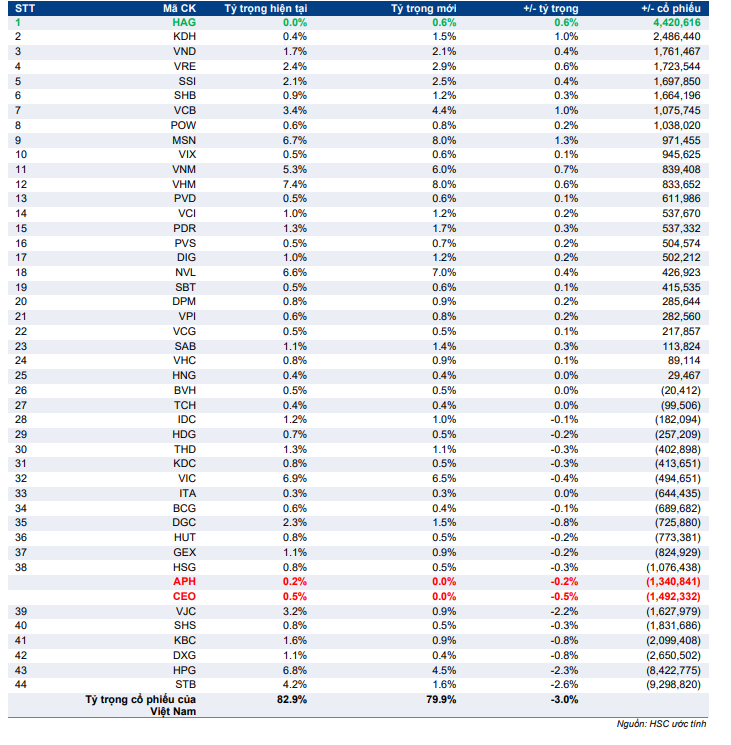 Với việc loại ra 2 cổ phiếu APH và CEO, quỹ ETF này sẽ cần bán ra khoảng 1,3 triệu cổ phiếu APH và 1,4 triệu cổ phiếu CEO. Ngoài ra, quỹ này sẽ cần mua vào tổng cộng khoảng 4,4 triệu cổ phiếu HAG. Ngoài ra, quỹ ETF này cũng sẽ cần bán ra một lượng đáng kể cổ phiếu HPG (8,4 triệu cổ phiếu), STB (9,2 triệu cổ phiếu), đồng thời bán ra một lượng đáng kể cổ phiếu KDH (2,4 triệu cổ phiếu), VRE (1,7 triệu cổ phiếu), VND (1,7 triệu cổ phiếu) và SSI (1,6 triệu cổ phiếu) (Bảng 3 & 4).