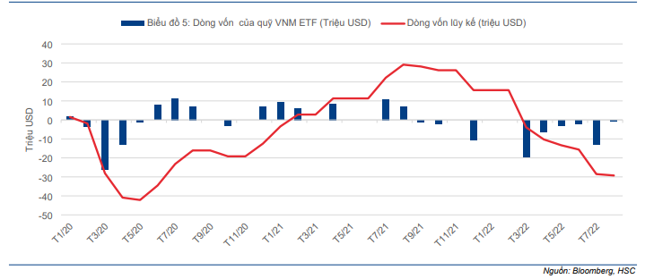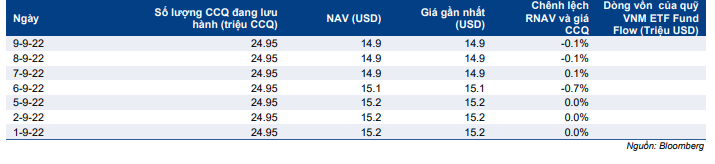 Kể từ đầu năm 2022 đến nay, quỹ ETF này đã liên tục bị rút ròng khoảng 44,9 triệu USD. Nhưng kể từ đầu tháng 9 đến nay, quỹ VNM ETF chưa giao dịch trên thị trường Việt Nam. Tuy nhiên, chứng chỉ quỹ của quỹ ETF này đang giao dịch với mức chiết khấu khoảng 0,09%, do đó, chúng tôi cho rằng khả năng thu hút vốn của quỹ này sẽ bị hạn chế trong thời gian tới.