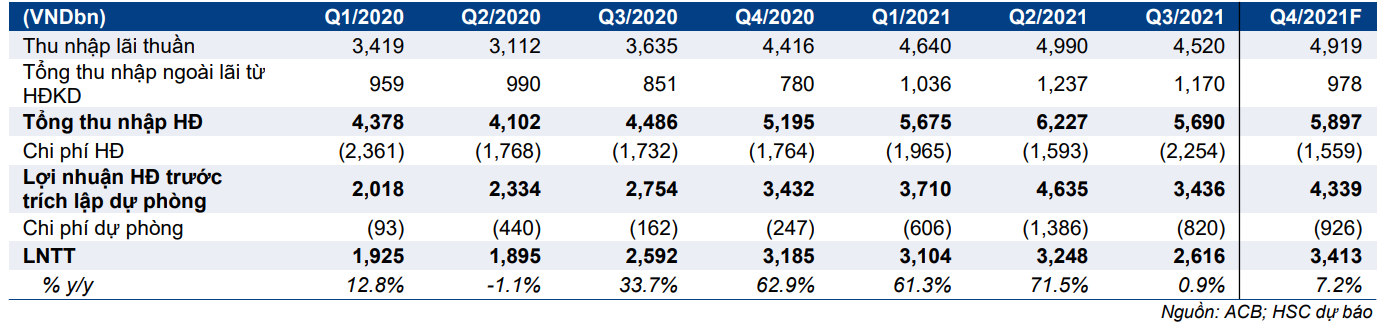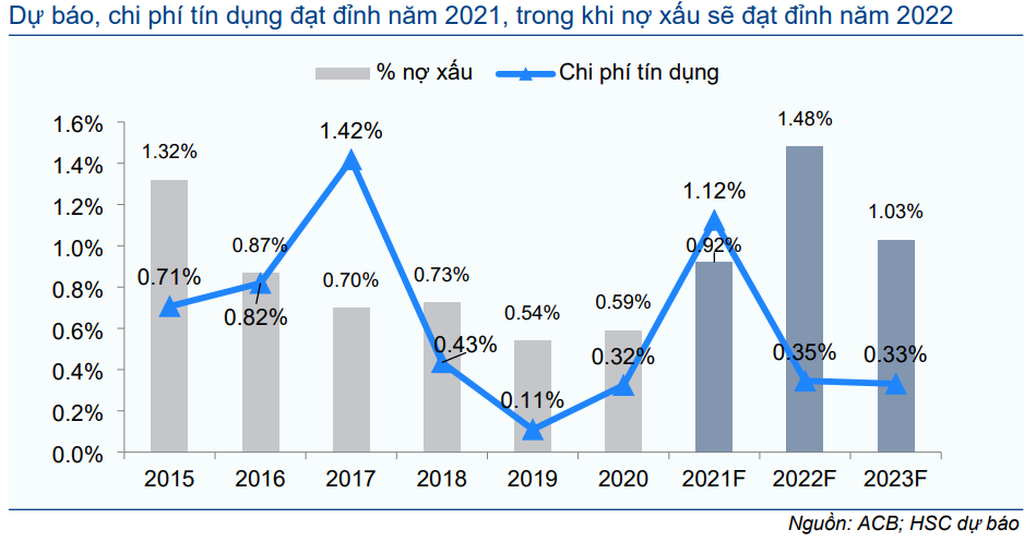 Trong thời gian tới, theo chúng tôi, thời kỳ xấu nhất của dịch Covid-19 sẽ kết thúc vào cuối năm 2021 và lợi nhuận của Cổ phiếu ACB sẽ hồi phục mạnh trong năm 2022, nhờ tổng thu nhập hoạt động tăng trưởng ổn định (tăng trưởng 14,7%) và quan trọng nhất là chi phí dự phòng giảm mạnh (giảm 65%). Hiện HSC dự báo lợi nhuận thuần năm 2022 tăng trưởng 38,3% và năm 2023 tăng trưởng 20,8%.