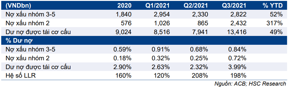 3Q21, even Theo đó, ACB đã trích lập bổ sung 650 tỷ đồng dự phòng cho nợ tái cơ cấu trong Q3/2021, theo đó tổng chi phí dự phòng đã trích lập cho nợ tái cơ cấu là 2.069 tỷ đồng. Số chi phí dự phòng này đã bao phủ 100% mức trích lập theo yêu cầu đối với nợ tái cơ cấu tính đến cuối Q3/2021, mặc dù theo quy định ACB được phép trích lập dự phòng trong 3 năm.