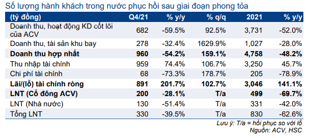 Lợi nhuận thuần Q4/2021 (thuộc về cổ đông ACV) là 200 tỷ đồng, giảm 28% so với cùng kỳ và thấp hơn 10% so với dự báo của chúng tôi là 220 tỷ đồng, nhưng tăng mạnh so với lỗ 767 tỷ đồng trong Q3/2021. Doanh thu hợp nhất Q4/2021 (bao gồm tài sản khu bay) là 960 tỷ đồng, giảm 54,2% so với cùng kỳ (nhưng tăng 159% so với quý trước) và vượt dự báo của HSC là 940 tỷ đồng.