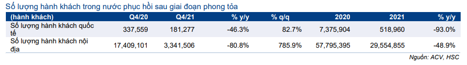 Những thay đổi về quy định cách ly và xét nghiệp trước khi bay được kỳ vọng sẽ tạo điều kiện cho các chuyến bay công tác cũng như du lịch. Nhờ đó, chúng tôi dự báo số lượng hành khách sẽ tăng đáng kể và theo đó sẽ thúc đẩy lợi nhuận của ACV trong năm 2022 (HSC đang xem xét lại dự báo).