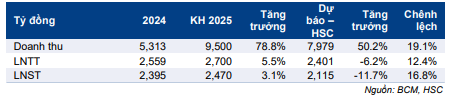 BLĐ BCM đề ra mục tiêu doanh thu thuần và LNST năm 2025 lần lượt là 9,5 nghìn tỷ đồng (tăng trưởng 78,8%) và 2,5 nghìn tỷ đồng (tăng trưởng 3,1%). Mục tiêu lợi nhuận cao hơn 16,8% so với dự báo của HSC ở mức 2,1 nghìn tỷ đồng, dựa trên giả định doanh thu từ hoạt động cho thuê đất KCN cao hơn. HSC đưa ra dự báo thận trọng nhằm phản ánh những lo ngại về (1) rủi ro liên quan đến chính sách thuế quan và tác động tiềm năng lên mảng BĐS KCN cốt lõi và (2) tình hình trở nên khó khó khăn hơn sau khi hoãn đấu giá cổ phiếu.