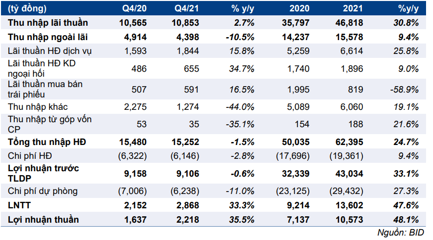 Bảng 1: KQKD Q4/2021 & cả năm 2021, BID