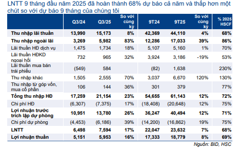 BID đã công bố LNTT Q3/2025 đạt 7,6 nghìn tỷ đồng, tăng 17% so với cùng kỳ nhưng giảm 12% so với quý trước, nhờ thu nhập lãi thuần tăng 8% so với cùng kỳ và thu nhập ngoài lãi tăng 83% so với mức nền thấp cùng kỳ, trong khi chi phí hoạt động và chi phí dự phòng tăng lần lượt 17% và 39% so với cùng kỳ. Kết quả thực hiện Q3/2025 thấp hơn so với dự báo của chúng tôi (9 nghìn tỷ đồng).