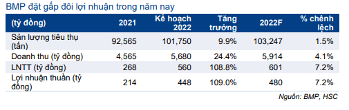 Kế hoạch LNTT và lợi nhuận thuần thấp hơn 7% so với dự báo hiện tại của HSC lần lượt là 601 tỷ đồng (tăng trưởng 124%) và 480 tỷ đồng (tăng trưởng 124%). Chúng tôi dự báo doanh thu đạt 5.914 tỷ đồng (tăng trưởng 29,9%), cao hơn 4% so với kế hoạch của BMP. Chúng tôi giả định sản lượng tiêu thụ sẽ tăng trưởng mạnh hơn đạt 103.247 tấn ống nhựa (tăng trưởng 11,5%) trong năm 2022.