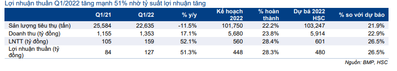 Do đó, tỷ suất lợi nhuận thuần trong Q1/2022 tăng lên 9,4% từ mức 7,3% trong Q1/2021. Từ đó, BMP đạt lần lượt 22,9% và 26,5% dự báo doanh thu thuần và lợi nhuận thuần cả năm 2022 của HSC.