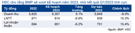 Bảng 1: Kế hoạch Công ty và dự báo của HSC năm 2023, BMP