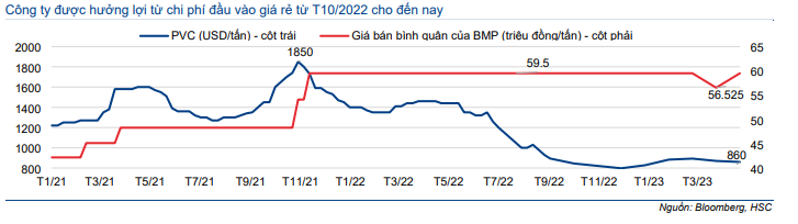 Giá hạt nhựa PVC ổn định ở mặt bằng thấp khoảng 900 USD/tấn (giảm 40% so với cùng kỳ) trở xuống, từ đó giúp tỷ suất lợi nhuận có thể tiếp tục cải thiện so với cùng kỳ. Mức tồn kho tại thời điểm cuối Q1/2023 ở mức thấp vì sản lượng tiêu thụ đạt cao trong tháng 3/2023. BMP dự kiến nâng cao hàng tồn kho trong thời gian tới, đưa hàng tồn kho về gần với mặt bằng bình thường.