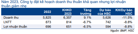 BMP trình kế hoạch trong năm 2023 vượt kỳ vọng, với doanh thu thuần tăng trưởng 9,1% đạt 6.357 tỷ đồng trong khi lợi nhuận thuần giảm nhẹ 6,5% so với cùng kỳ xuống 651 tỷ đồng. Lợi nhuận thuần sụt giảm chủ yếu do mức nền cao và nhu cầu đối với các sản phẩm vật liệu xây dựng dự kiến thấp do thị trường bất động sản đang gặp khó khăn.