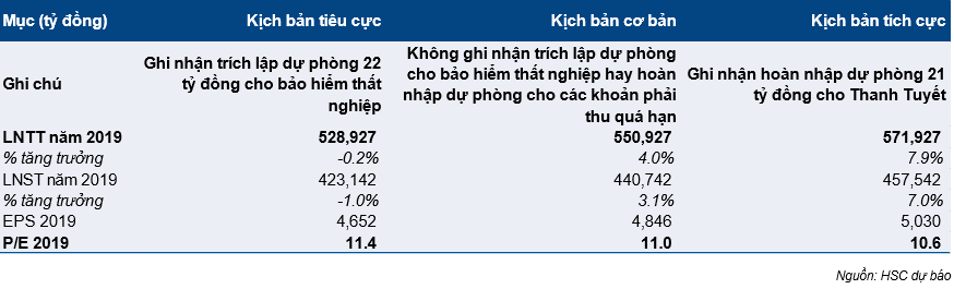 - Ngoài ra, thông thường, tỷ lệ trích quỹ khen thưởng phúc lợi từ LNST theo như nghị quyết ĐHCĐTN là 9%. Hiện tại, chúng tôi được biết Công ty đang xem xét phân bổ thưởng ngay trong kỳ cho toàn bộ nhân viên theo khuyến nghị của đơn vị kiểm toán. Tuy nhiên chúng tôi hiểu rằng quỹ khen thưởng phúc lợi chỉ được phép chi trả theo nghị quyết ĐHCĐTN. Công ty có thể xin kiến ĐHĐCĐ về vấn đề này sau thay vì hạch toán ngay trong năm tài chính 2019. HSC ước tính số tiền này là 38 tỷ đồng, tương đương 9% LNST theo kế hoạch đề ra.