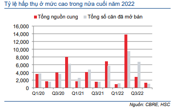 Trong khi đó, tỷ lệ hấp thụ vẫn ở mức cao tại cả 2 thành phố này trong nửa cuối năm 2022, với tỷ lệ hấp thụ tại TP.HCM là 188% (so với 73% trong nửa đầu năm 2022) và Hà Nội là 82% (so với 133% trong nửa đầu năm 2022). Tỷ lệ hấp thụ cao phần lớn nhờ giao dịch tại các dự án hiện hữu do các chủ đầu tư đang trì hoãn mở bán dự án mới trong giai đoạn kinh tế khó khăn và nhu cầu thấp.