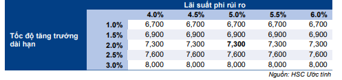 Chúng tôi tiếp tục áp dụng phương pháp DCF để định giá cổ phiếu CRE. Giả định lãi suất phi rủi ro là 5% (không đổi), beta là 0,9 lần và phần bù rủi ro vốn CSH điều chỉnh là 10% (thêm 2 điểm phần trăm phần bù phụ trội so giả định nội bộ của HSC). Theo đó, giả định chi phí vốn bình quân WACC mới là 14,6% (không đổi).