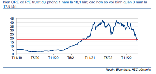 Sau khi giá cổ phiếu giảm 22% trong 3 tháng qua, hiện Cổ phiếu CRE có P/E trượt dự phóng 1 năm là 18,1 lần; cao hơn so với bình quân 3 năm là 17,8 lần. Điều này chủ yếu là vì rủi ro pha loãng sau khi CRE tăng mạnh vốn điều lệ lên 4,6 nghìn tỷ đồng (từ 2 nghìn tỷ đồng).