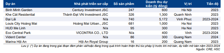 Chúng tôi kỳ vọng doanh thu tại dự án mới, KDC Khe Cát trong năm nay, trong khi giai đoạn mới của dự án Louis City (Hoàng Mai) có thể sẽ được ghi nhận vào cuối năm 2023 sau khi thủ tục pháp lý được chấp thuận. Chúng tôi kỳ vọng CRE sẽ đẩy mạnh bán các dự án hiện hữu khác bao gồm Mê Linh HUD (Hà Nội), Bình Minh Garden (Hà Nội), Eco Central Park (Vinh).