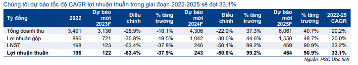 Chúng tôi không đưa ra dự báo đối với các khoản mục không thường xuyên trong giai đoạn 2023-2025. Nhìn chung, chúng tôi dự báo tốc độ CAGR lợi nhuận thuần trong giai đoạn 2022-2025 sẽ đạt 33,1%.