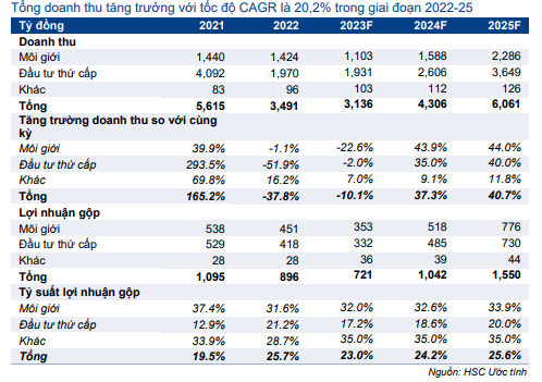 - Chúng tôi dự báo thị trường sẽ chưa cải thiện đáng kể trong năm 2023. Do đó, chúng tôi dự báo doanh thu mảng môi giới sẽ giảm 22,6% so với cùng kỳ xuống 1,1 nghìn tỷ đồng. Chúng tôi cho rằng thị trường sẽ phục hồi kể từ năm 2024 và doanh thu sẽ tăng trưởng 43,9% đạt 1,6 nghìn tỷ đồng. Nhìn chung, chúng tôi dự báo tốc độ CAGR doanh thu mảng môi giới trong giai đoạn 2022-2025 sẽ đạt 17,1%.