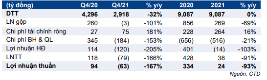 CTD công bố KQKD Q4/2021 với doanh thu đạt 2,9 nghìn tỷ đồng (giảm 32,1% so với cùng kỳ) và lỗ thuần 63 tỷ đồng so với lãi thuần là 94 tỷ đồng trong Q4/2020. Lỗ thuần thấp hơn so với dự báo của chúng tôi chủ yếu do thu nhập tài chính cao hơn dự báo và chi phí dự phòng cho các khoản phải thu khó đòi trong kỳ thấp hơn dự báo.