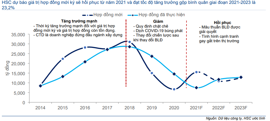 Cho năm 2021, HSC giảm 28,2% dự báo doanh thu xuống còn 7,5 nghìn tỷ đồng (giảm 48,5%) vì hoạt động xây dựng diễn ra trầm lắng tại các công trình của CTD do giãn cách xã hội nghiêm ngặt tại Hà Nội, TP HCM, Đà Nẵng và 19 tỉnh phía Nam. HSC dự báo CTD sẽ ký được tổng cộng 15,5 nghìn tỷ đồng hợp đồng mới trong năm nay. Theo đó tổng giá trị hợp đồng chưa ghi nhận tại thời điểm cuối năm 2021 là 16,8 nghìn tỷ đồng.