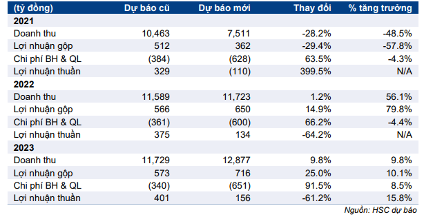 HSC lần lượt giảm 400%; 64,2% và 61,2% dự báo lợi nhuận năm 2021, 2022 và 2023; chủ yếu do tác động của dịch Covid-19 và chi phí dự phòng tăng. Thông tin chi tiết về những thay đổi trong dự báo của chúng tôi được bình bày trong bảng dưới đây.