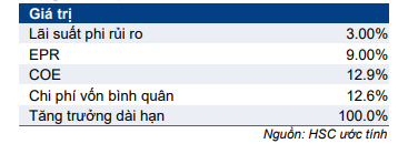 - Mô hình DCF của HSC sử dụng chi phí vốn bình quân WACC là 12,6%. Lãi suất phi rủi ro là 3%; hệ số bê ta là 1,1 và phần bù rủi ro vốn cổ phần là 9%; chi phí vốn CSH là 12,9%. HSC giả định tỷ lệ nợ/vốn CSH 5 năm tới là 7,3%.