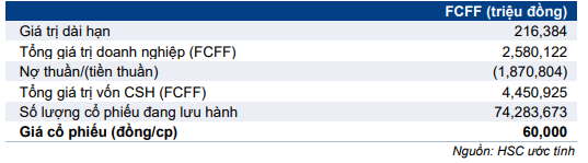 - Áp dụng mô hình DCF 2 giai đoạn để định giá. HSC dự báo giai đoạn 2021-2026 là giai đoạn tăng trưởng; sau đó chúng tôi áp dụng tốc độ tăng trưởng dài hạn là 1% để tính giá trị dài hạn.