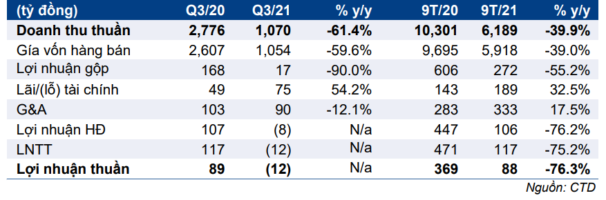 CTD công bố KQKD Q3/2021 với doanh thu là 1.070 tỷ đồng (giảm 61,4% so với cùng kỳ) và lỗ thuần 11,8 tỷ đồng (so với lãi thuần 88,7 tỷ đồng trong Q3/2020). KQKD Q3/2021 kém đúng như dự báo của chúng tôi.