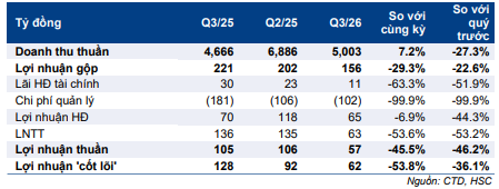 - Lợi nhuận từ HĐKD cốt lõi: 62 tỷ đồng (giảm 53,8% so với cùng kỳ và giảm 36,1% so với quý trước).