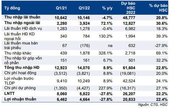 Bảng 1: Tóm tắt KQKD Q1/2022 của CTG