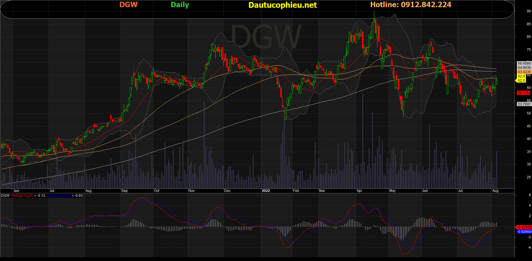 Đồ thị cổ phiếu DGW phiên giao dịch ngày 04/08/2022. Nguồn: AmiBroker
