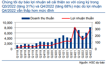 HSC dự báo doanh thu Q4/2022 sẽ tăng 35% so với quý trước đạt 8.077 tỷ đồng (tăng 2% so với cùng kỳ) và lợi nhuận thuần cũng tăng 64% so với quý trước đạt 295 tỷ đồng (giảm 10% so với cùng kỳ từ nền cao). Ở từng sản phẩm, chúng tôi dự báo như sau: