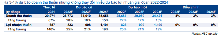Dự báo mới cho năm 2022-2024: Giảm dự báo doanh thu nhưng giữ nguyên dự báo lợi nhuận thuần