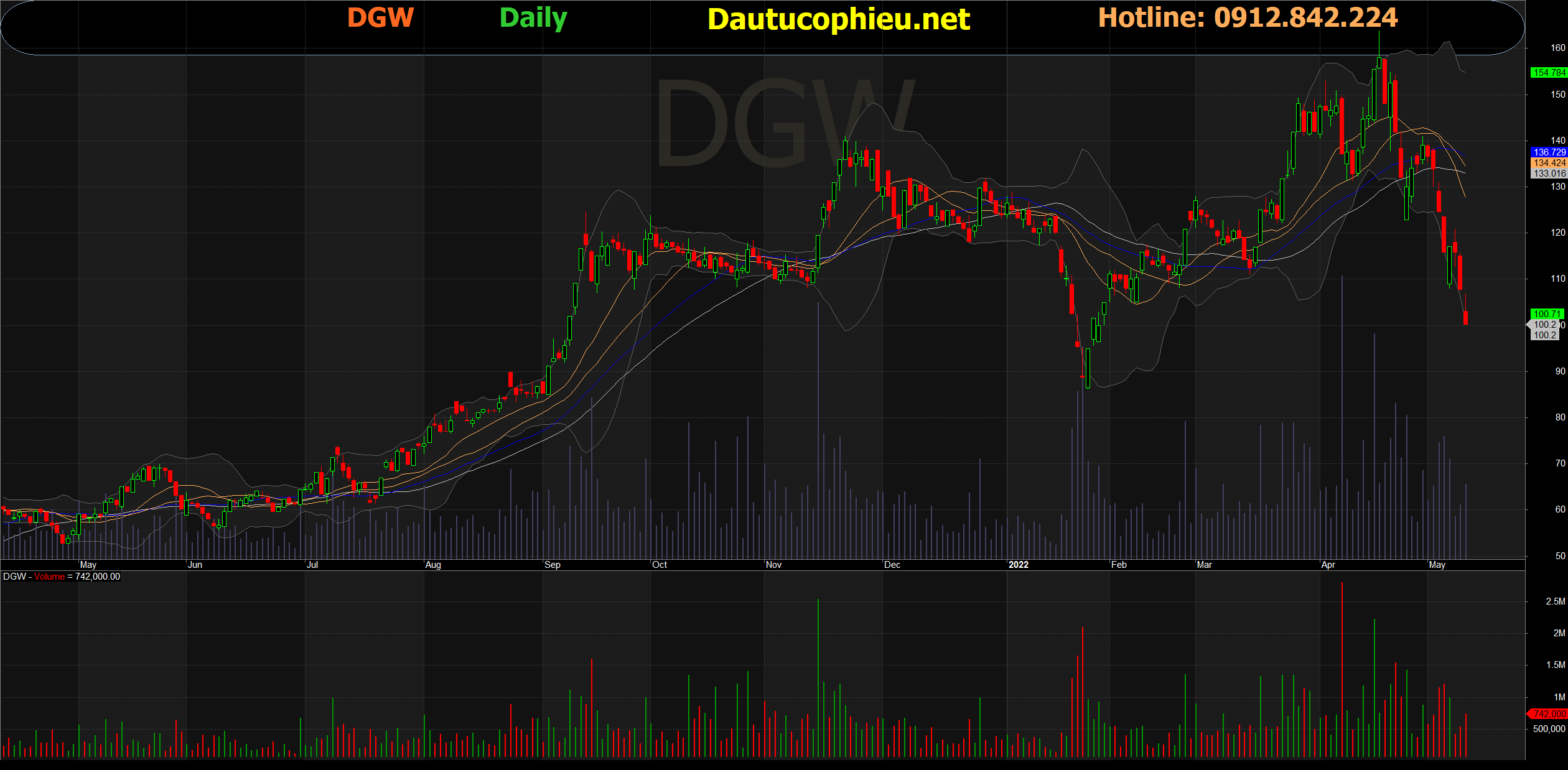 Đồ thị cổ phiếu DGW phiên giao dịch ngày 13/05/2022. Nguồn: AmiBroker