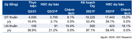 Với kết quả thực hiện Q3/2021 và kế hoạch Q4/2021 vượt kỳ vọng của HSC, chúng tôi đang xem xét lại dự báo cho năm 2021-2023, giá mục tiêu và khuyến nghị đối với DGW.