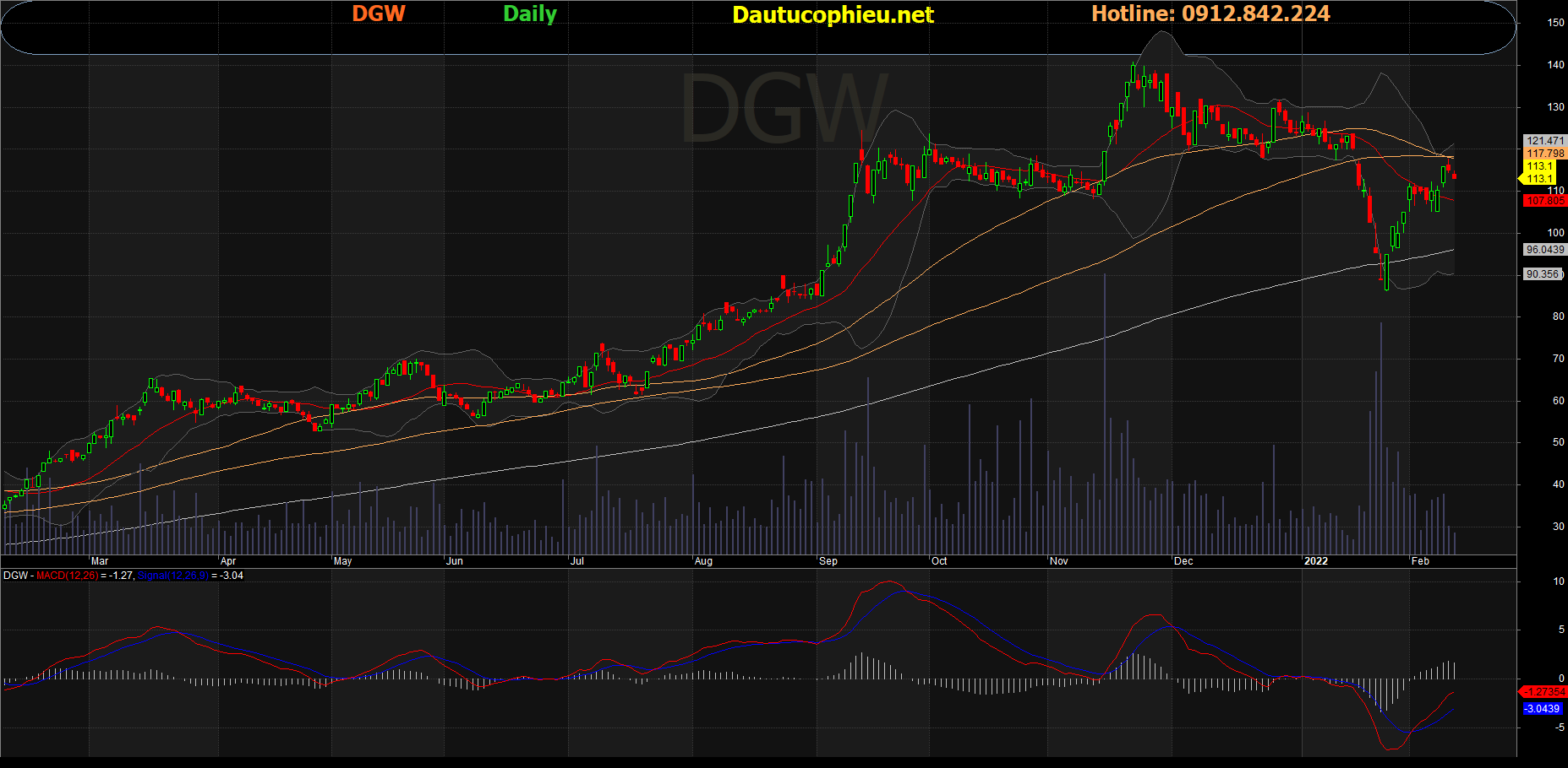 Đồ thị cổ phiếu DGW phiên giao dịch ngày 17/02/2022. Nguồn: AmiBroker