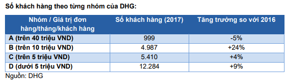 DHG dự kiến doanh thu các sản phẩm tự sản xuất năm 2018 sẽ tăng 15% so với năm 2017 nhờ hệ thống phân phối mới ổn định hơn và công ty đẩy mạnh tiếp cận các khách hàng nhỏ hơn. Hiện 52% khách hàng của DHG thuộc nhóm D (giá trị đơn hàng hàng tháng dưới 5 triệu đồng/khách hàng). Nhóm này hiện chiếm chưa đến 20% doanh thu từ các sản phẩm tự sản xuất của DHG. Chiến lược của DHG là tăng số SKU tại các điểm bán lẻ nhỏ nhằm giảm phụ thuộc vào các khách hàng lớn như các công ty bán buôn và các nhà thuốc lớn.